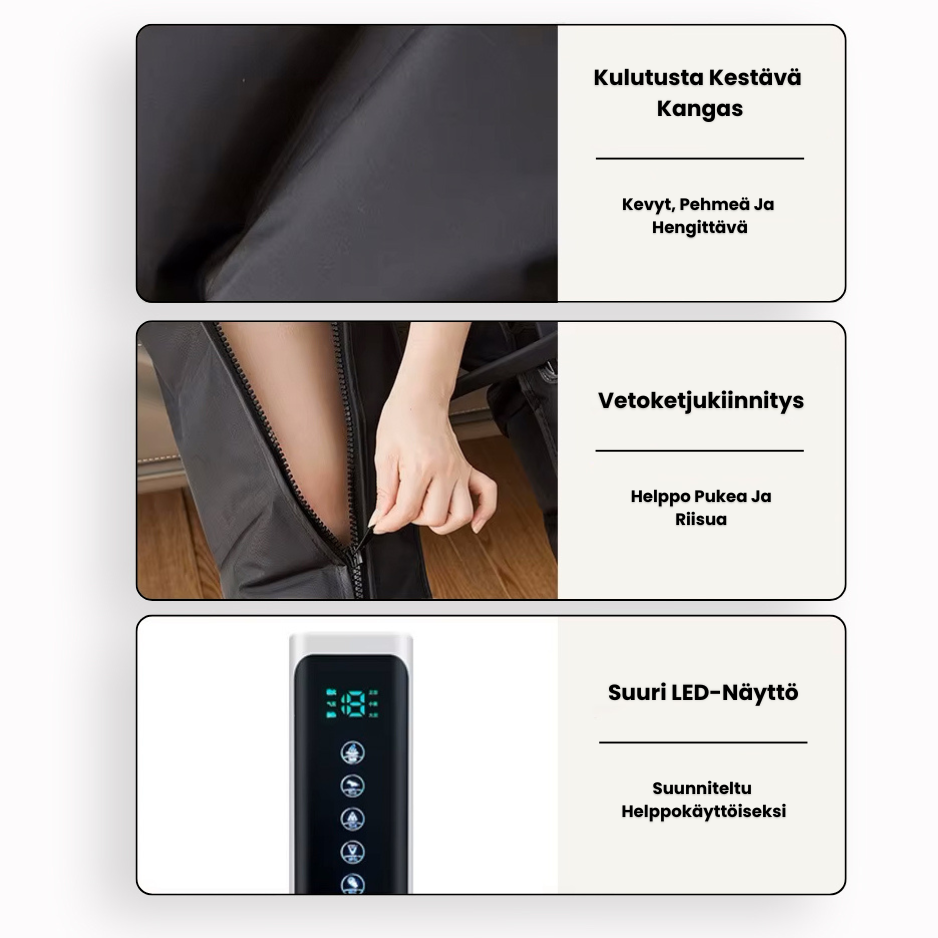 Olemme yhdistäneet ammattilaisten käyttämän kompressioteknologian helppokäyttöiseen muotoon, joka tuo fysioterapiatasoisen hoidon suoraan kotisohvallesi. Pue saappaat jalkaan ja tunne, kuinka dynaaminen paine hellittää jännityksen, vilkastuttaa verenkiertoa ja korvaa raskaan tunteen keveydellä. Se on sinun päivittäinen nollauspainikkeesi – hetki, jolloin investoit tärkeimpään, eli itseesi.